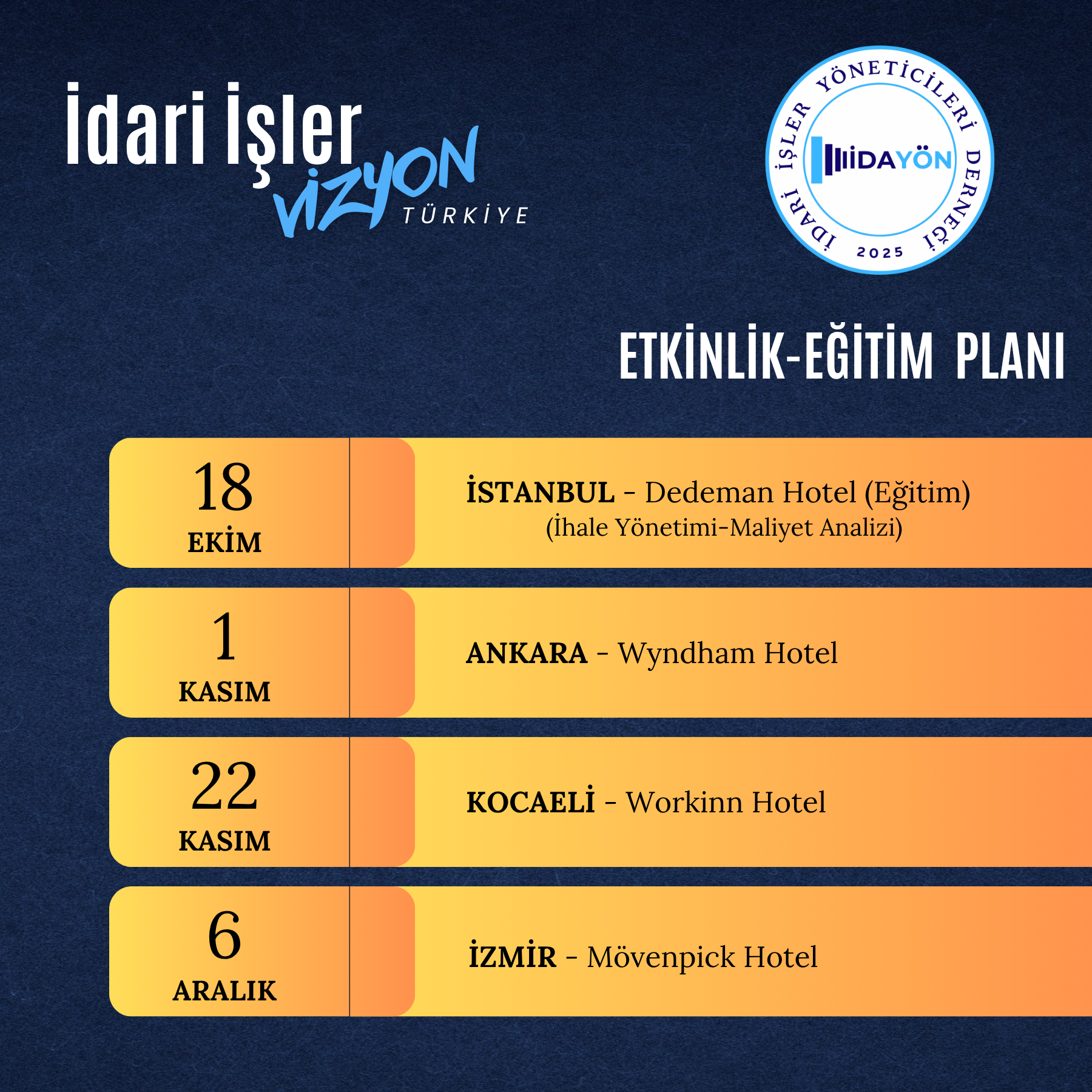 2025 yılı son çeyrek etkinlik ve eğitim takvimimiz yayınlandı! İDAVİZYON serisi hız kesmeden devam ediyor.